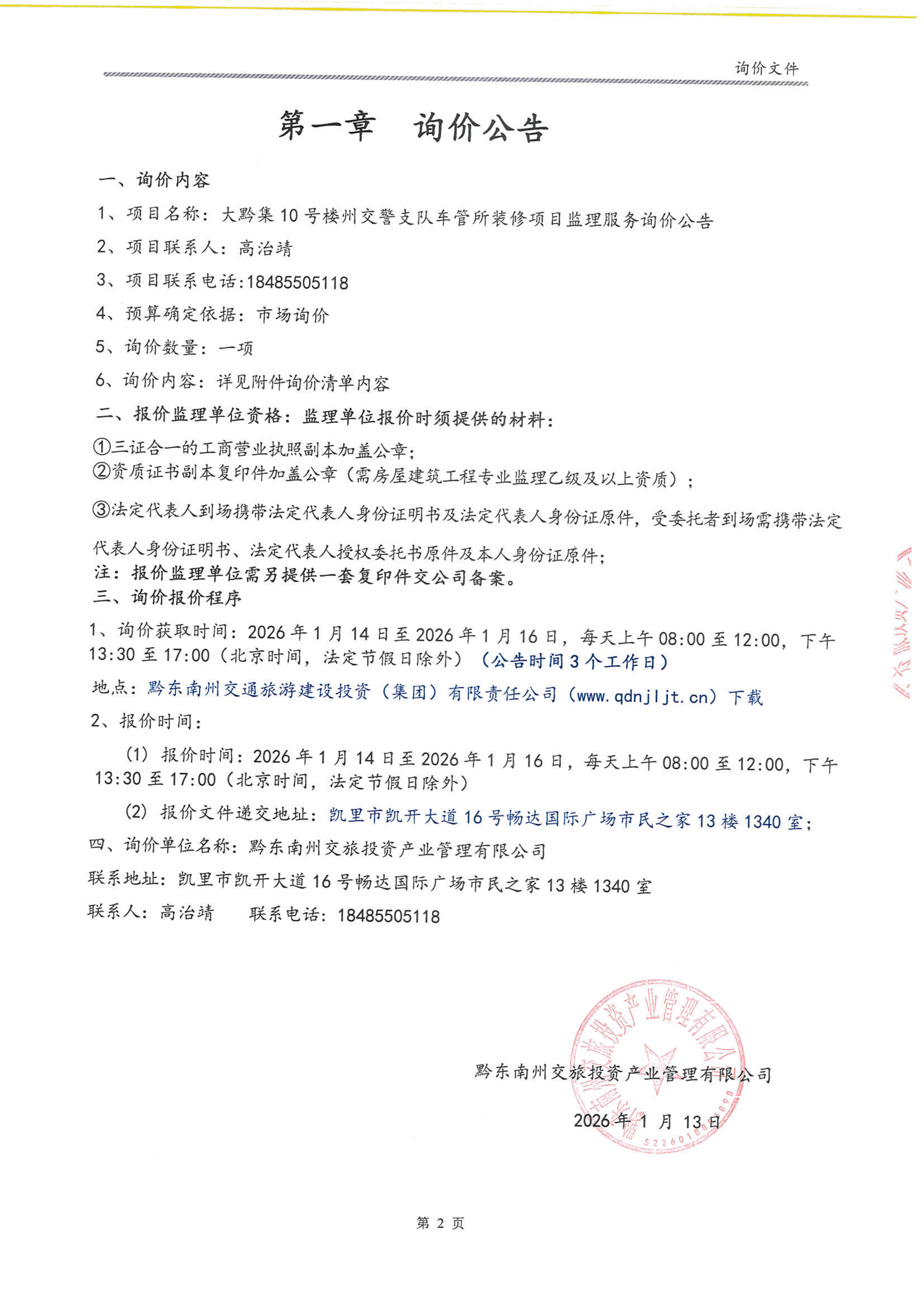 大黔集10号楼州交警支队车管所装修项目监理服务询价公告