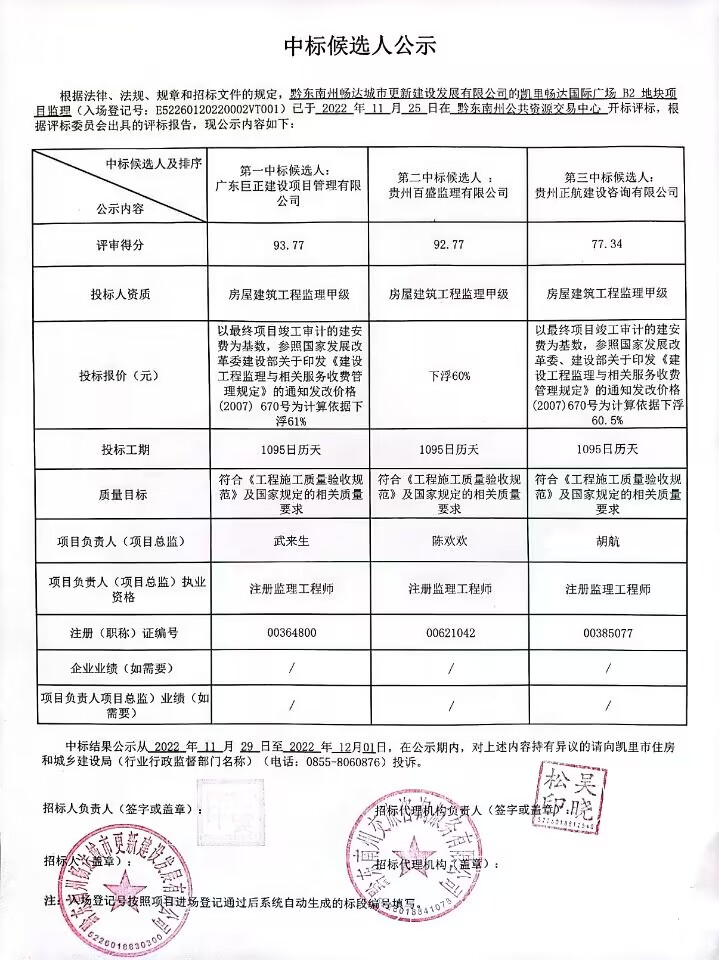 凯里畅达国际广场 B2 地块项目监理中标候选人公示